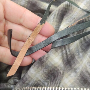 Some wear on leather tassels, some fading on corners of suede to brown. Lipstick stain on lining.