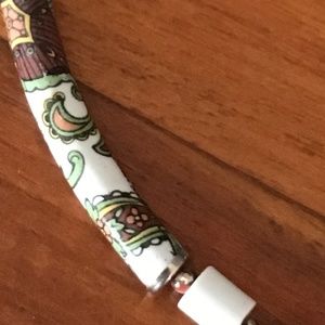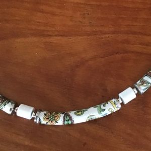 Great vintage necklace offering tubular beads with green, orange, yellow and brown design.