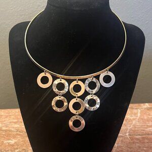 Vintage bold geometric statement choker necklace featuring a series of gold tone metal circular pendants of varied texture. The base of the necklace is a rigid metal collar, slightly flared for a comfortable fit, with a sleek, polished finish that sits close to the neck.