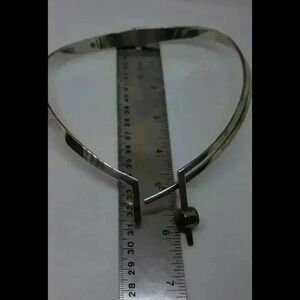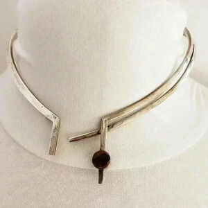 Vintage Mexican 925 Sterling Silver Choker Modernist with Tigers Eye & Onyx gemstones that are Reversible . This piece is well made, the spring connector at the back is nice and tight. The gem piece turns so you can wear it showing the Tigers Eye or turn it to show the Black Onyx. Could use a little silver polish. Its class mid century modern from Taxco.