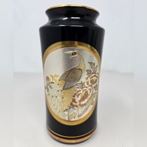 Vintage Chokin Collection Vase Engraved Bird Design With Flower Black Pottery