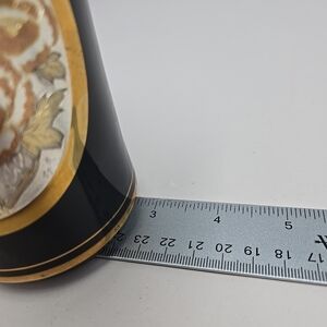 The Vintage Chokin Collection Vase features a beautifully engraved bird design with a flower motif on black pottery. Handmade in Japan, this piece showcases traditional Japanese culture and craftsmanship. The intricate details and unique design make it a stunning addition to any collectibles or vases & jars collection, reflecting the beauty and artistry of Japanese heritage.