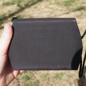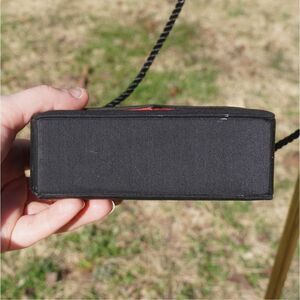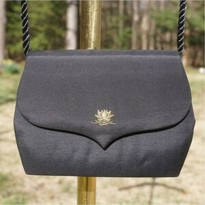 - Beautiful black structured sateen satin mini evening purse with gold embroidered lotus flower detail, can be worn on shoulder or as clutch, by Chopard Casmir