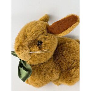 This vintage plush bunny, crafted by Chosun in Korea, features a soft brown fur coat, a charming green bow, and a white tail. A delightful collectible.