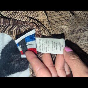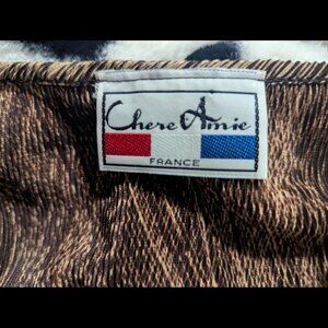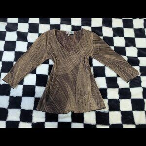 Unique vintage Chère Amie pleated blouse in a rich brown and tan abstract pattern. Features a flattering V-neck, 3/4 sleeves, and lightweight crinkle-textured fabric. Made in the USA 🇺🇸 from 100% polyester. Super stretchy and comfy – perfect for a retro or artsy look!