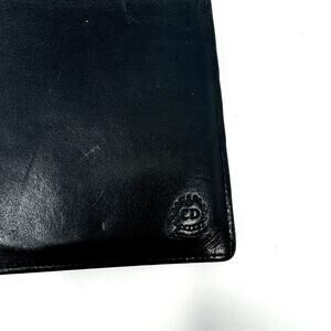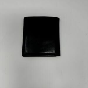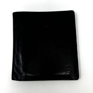 Black bi-fold wallet with credit card slots and cash opening. Embossed logo on outside of wallet, full designer name on inside. Excellent condition with age related wear.