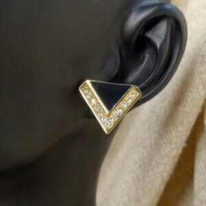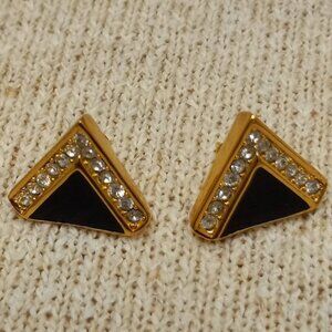 Vintage Christian Dior Earrings Gold-Tone Triangles Rhinestones & Black Enamel.