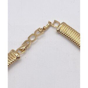 Elegant vintage Christian Dior gold-tone collar choker necklace, dating to the 1980s–1990s. Features a tubular omega-style design with articulated front links accented by sparkling Austrian crystals and glossy enamel insets — a bezel-set center stone with pavé crystal and enamel side accents. Signed Chr. Dior © on the clasp. Timeless and sophisticated, perfect for evening wear, bridal, or a collector of designer vintage jewelry.
