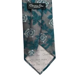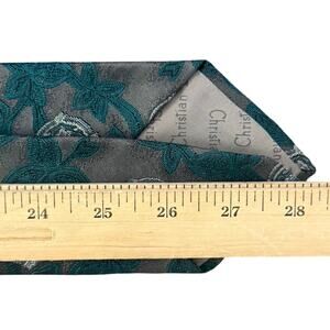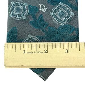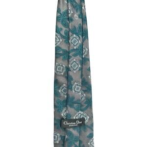 Vintage Christian Dior Gray Teal White Diamond Floral Leaf Silk Blend Necktie