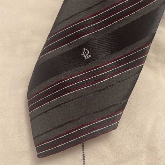 Vintage Christian Dior Men's Necktie with Black, Red, Gray Striped Skinny Tie 56” long