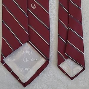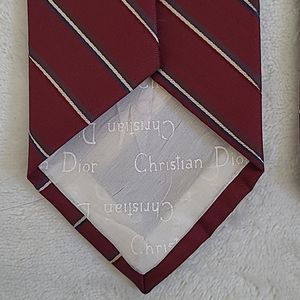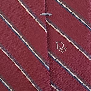 Vintage Designer Christian Dior Men's Repp Necktie in Burgundy, Navy Blue and White Regimental Stripe. Dior Embroidered in White at the Base of the Necktie and Intermittently Throughout the Necktie. There Is No Label To Indicate What This Necktie Is Made of, But it Feels Like A Silk Blend. Seam is Intact. Label Is Intact, Bar Tack is Intact. Tipping in White with Christian Dior Spelled Out. Adjustable, Self Tie. Classic Width, Short Length. See Pictures for Approximate Measurements. In Great Condition!