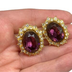 Vintage Christian Dior Pierced Style Purple Clear Rhinestone Gold Tone Earrings