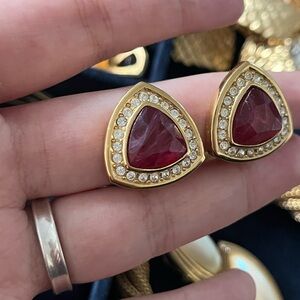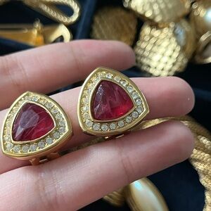 Vintage Christian Dior Red Swirly Glass Rhinestone Triangular Gold EARRINGS ONLY