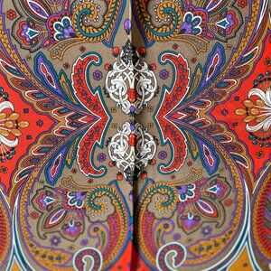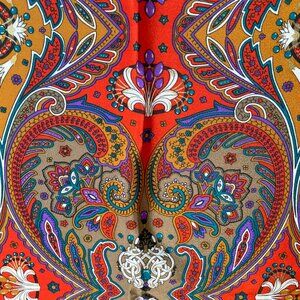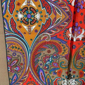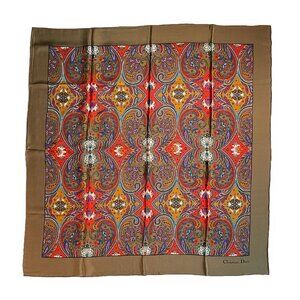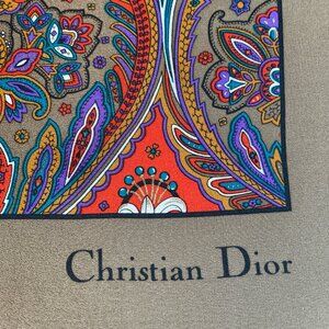 Elegant and timeless, this Christian Dior silk scarf features a vibrant paisley-inspired design in shades of red, gold, purple, and green. Crafted in silk with a rolled hem finish, it showcases Dior’s attention to detail and artistry.