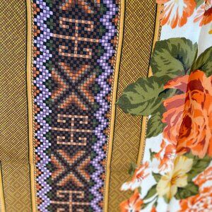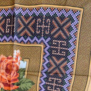 This vintage Christian Dior chiffon silk scarf offers a lightweight, airy elegance. It features a stunning floral design with vibrant orange roses, lilac blossoms, and golden accents framed by an intricate geometric border in earthy tones. A statement accessory with timeless sophistication.