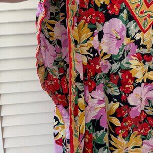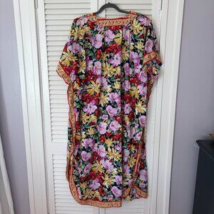 Vintage Christian Dior Saks Fifth Avenue caftan, one size. Bold floral print. V-neck. 100% cotton. Pullover style. Short sleeves, hit at or above elbows. Pink, red, yellow, and other colors. Has shoulderpads. One of the shoulderpads doesn't sit quite right (folded over) on the shoulder.