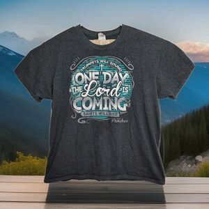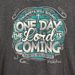 This Vintage Christian "Punches family" band women's XL t-shirt features a "One Day the Lord is Coming" graphic print, making it a unique and nostalgic piece for any music lover. The shirt is made from a comfortable cotton blend material with a solid gray color and short sleeves, perfect for casual wear. With a crew neck and pullover closure, this t-shirt offers a regular fit and is machine washable for easy care. The vintage style adds a touch of charm to this basic wardrobe essential from the Fruit of the Loom brand.