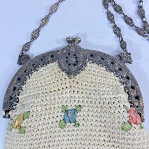 Vintage Christiana Brand Handbag Purse Ribbon Embroidered Chain Strap Ivory
