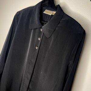 This longer length blouse could be worn as a mini dress. I would style it with a belt to add more structure, but it would also look very chic with no belt. Peter Pan collar, three visible black and gold buttons at the top, and hidden buttons the rest of the way down the shirt. Another feature of this blouse is the added shoulder pads, which is very indicative of the late 80's, early 90's, lending a more business like feel to this. The the cuffs at the wrists have one button each, but could be worn rolled up. Good pre-loved condition.