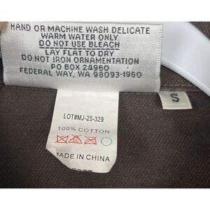 The jacket is machine washable, has a button closure, and is unlined. It features pockets and a collared neckline, making it a versatile and practical choice. The jacket is available in size S and is suitable for all seasons. Refer to the tag for fiber content.