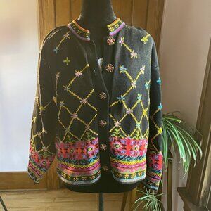 Vibrant vintage Christine Foley cardigan featuring colorful embroidered stitching and unique enamel-look painted buttons. Black base with bold rainbow geometric embroidery, detailed woven trim, and a slightly boxy fit that flatters XS–M depending on desired drape.
