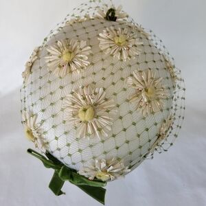 Vintage mid century hat by Christine Original. Ivory round flat woven cap/hat with small brim, covered in fabric daisy flowers and green netted veil. Has green velvet trim with bow in the back. Inside brim is ribbon backed. Overall very good condition. Minor discoloration on inside brim. Stands approx 3" tall, opening measures 7" x 6".
