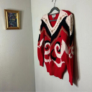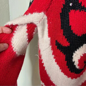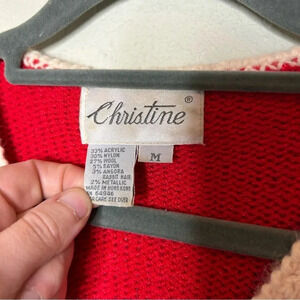 Beautiful vintage sweater from Christine. Blend of Acrylic, nylon, wool, rayon and angora rabbit hair. Red with black, cream and metallic gold accents. Some pearls are missing around the left area where the body and arm meets. Otherwise, in very good condition for its age. Great, unique piece!