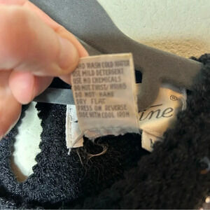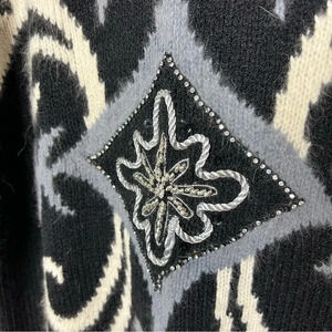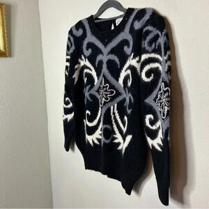 Gorgeous piece from the '80s! Blend of acrylic, nylon, wool, angora. Black with gray and cream detailing. Rhinestone embellishments (there are a handful missing, please note). Measures 21.5" pit to pit, 25" top to bottom. Fantastic piece!