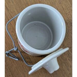 This Vintage Christmas 1987 Cheese Crock Stoneware with Lid & Wire Bale Handle is a charming addition to any farmhouse-style kitchen. Made of ceramic in a solid white and red color scheme with candy canes, this cylinder-shaped crock features a single compartment and a wire bale lid for easy access. With dimensions of 4.5 inches in length and height, this original piece from the 1980s is perfect for storing and displaying holiday treats or decorations. Made in the United States, this collectible item is a nostalgic reminder of Christmas past.