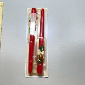 This vintage set of two 8” red taper candles features festive embellishments, including a bell and holly design, ideal for seasonal decorating. They are new in package
