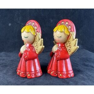 Vintage Christmas Angel Figurines Pair Red Gold Praying Mid Century Mod Retro