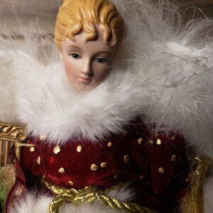 Beautiful angel in velvet and fur holding a harp - gold rope around her waist. Ceramic head and hands.