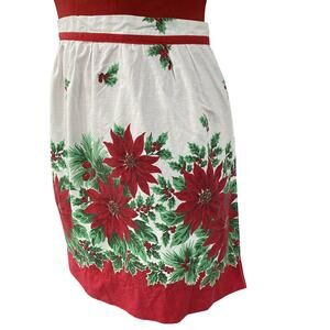 Vintage Christmas Apron Printed Cotton Red White Green Poinsettias & Holly motif. Perfect for the holiday hostess. This is a half-apron style with long sash ties that will fit most sizes. Appears to be handmade with care - love the red ribbon trim at the waist! In excellent vintage condition - very light wear - great colors - no significant damage or blemishes.