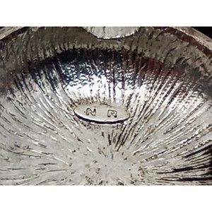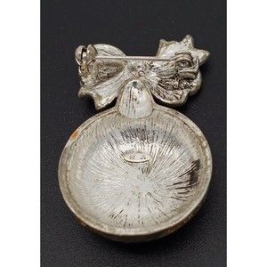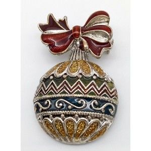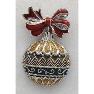 This lovely vintage Christmas ball ornament brooch pin was found at an estate sale. The brooch is made of silver tone metal and features a Christmas ball ornament detailed in colorful enamel with a nice design and a bow ribbon at the top. The back has a rollover c-clasp fastener and is signed, "NR". The brooch measures 1.71" high x 1" wide x .42" deep. Please note that there is a little tarnish/patina on the back of the brooch. This pretty brooch is still in good vintage condition. It would make a wonderful Christmas holiday brooch and a great addition to your jewelry collection.