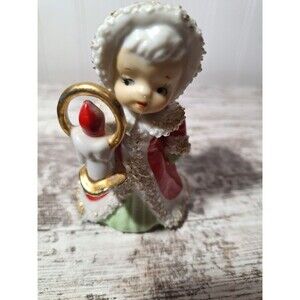 This vintage Lefton Christmas figurine features a beautiful angel holding a candle with a spaghetti trim. Made of ceramic and porcelain, it was manufactured in Japan in 1950 as part of the Classic Collection. The angel is dressed in a red outfit and is perfect for collectors who love angel figurines. The item is in good shape and would make a great addition to any holiday or seasonal collection.