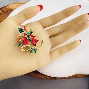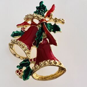 Vintage Christmas Bells Holly Berry Bow Brooch Red Green Enamel Gold Tone 4173