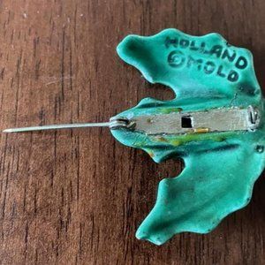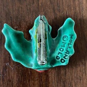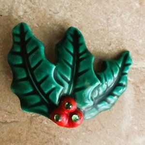 Holland Mold vintage Christmas brooch, lapel pin featuring holly and red berries. The ceramic brooch was made using Holland Molds and has a length of 2 inches. This vintage piece adds a touch of nostalgia to any outfit. The brooch has holly leaves and red berries with green rhinestones The brooch is a vintage item and adds a sense of history and uniqueness to your collection. This brooch will be shipped in a jewelry box.