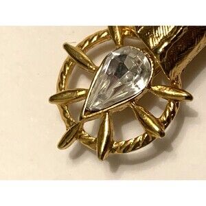 This is a vintage gold-toned Christmas candle brooch/pin. Depicts a candle in a holder adorned with holly leaves and red and green rhinestones. The "flame" is a clear teardrop-shaped rhinestone. Pre-owned. Good condition. Minor wear, the "flame" rhinestone is a little flawed, see pictures.