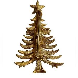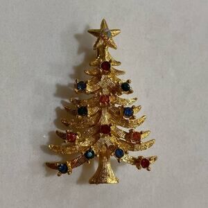 Vintage Christmas Brooch Tree Rhinestone pin gold tone Rafael MCM