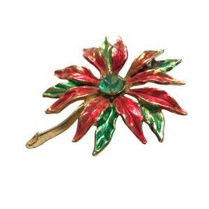 Vintage Christmas holiday brooch - a large poinsettia shape - goldtone metal setting with red and green wash and a single light green rhinestone at the center. No hallmarks but nice novelty fashion jewelry in good condition and ready to wear!