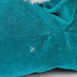 Both are in good gently loved condition but do show signs of age in their plush material as it is no longer bright white; both have areas that appear grey (see photos for examples) on the plush material. One has a glue type residue on one leg (see photo) and one has a small area of discoloration on the printed fabric of one ear (see photo).