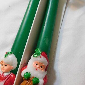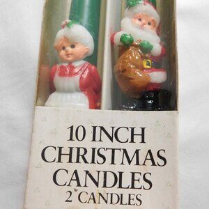 Vintage Christmas Candles Santa and Mrs. Claus 10 Inch Candles. Candles are new, box has shelf wear/creases, as does the plastic on the front.