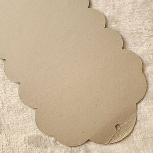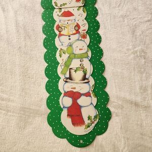 Cardboard holiday scene with Santa and snowmen, folds and is double layered, it 42.5" long and 6" wide. Other than wear it folds getting a little worn and at the home for hanging out is in good shape