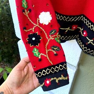 Vintage Christmas sweater cardigan, absolutely gorgeous. Made beautifully with gold colored threading, sequins, seed beads, bugle beads, high quality knitting 🧶 I haven’t attempted to clean, adjust, alter to keep it to its original vintage condition.