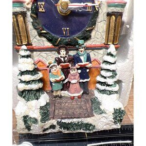 This intricately detailed clock features a charming scene of Christmas carolers and snowy evergreen trees. The Roman numerals and angelic accents add a classic touch to this decorative timepiece. Perfect for bringing a nostalgic holiday atmosphere to any room.