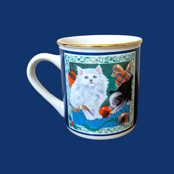 Vintage Christmas Cat Mug by Papel, Cat Playing w/ Ornaments Gold Rim Coffee Cup