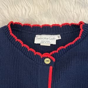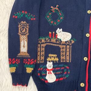 This is a vintage "ugly Christmas" cardigan from Sweater Loft, featuring various holiday-themed Scene applique designs, including cats, a Christmas tree, a grandfather clock, and presents.