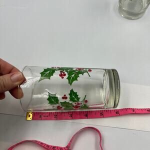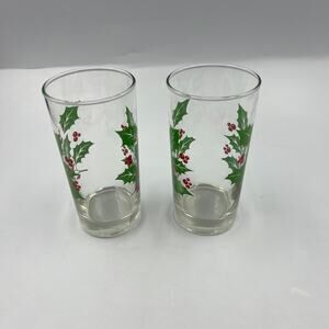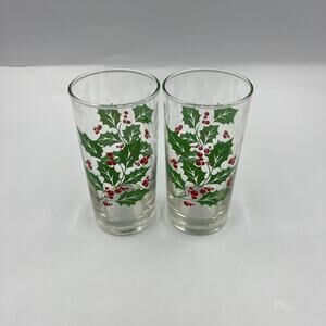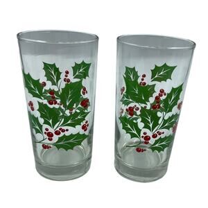 Vintage set of two Christmas drinking glasses, holly berry and greenery etched pattern. Both glasses are in good condition, no cracks or chips as pictured.