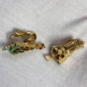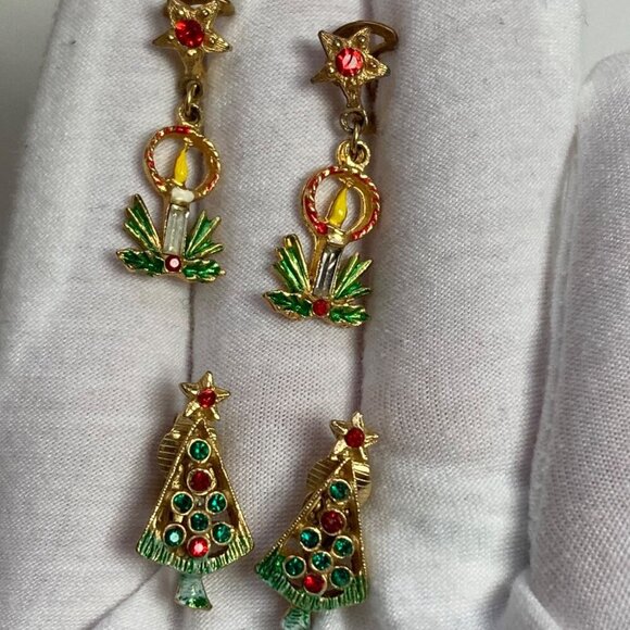 Vintage Christmas Clip On Earrings 2 Pr XMas Tree Candle Gold Tone Rhinestones