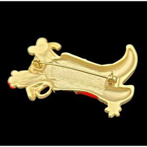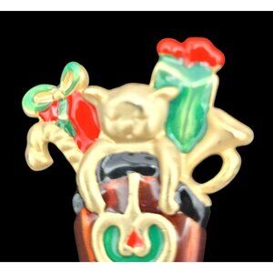 This vintage brooch features a charming Christmas cowboy boot design with colorful enamel detailing and a festive motif of a cat, candy canes, and gifts. The gold-tone finish adds a touch of elegance, making it a stylish accessory for the holiday season.